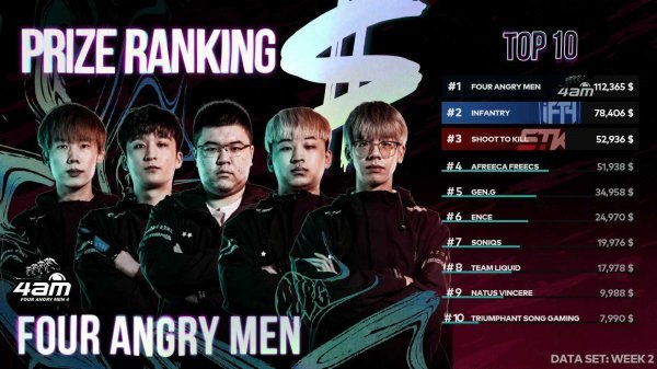 전 세계 8개 지역 32개 팀이 온·오프라인으로 출전하는 PGI.S는 주중에 위클리 서바이벌, 주말에 위클리 파이널이 진행된다. 20일과 21일 펼쳐진 2주 차 위클리 파이널 경기 결과, 중국의 Four Angry Men과 infantry가 각각 1, 2위를 차지했다. Four Angry Men은 합산 53킬 85포인트로 1주 차보다 증가한 상금인 5만 달러를 획득했다. 여기에 Pick’Em 챌린지 이벤트를 통한 팬들의 크라우드 펀딩 상금이 추가돼, 2주 차까지 11만 2,365달러로 누적 상금 순위로도 1위에 등극했다.