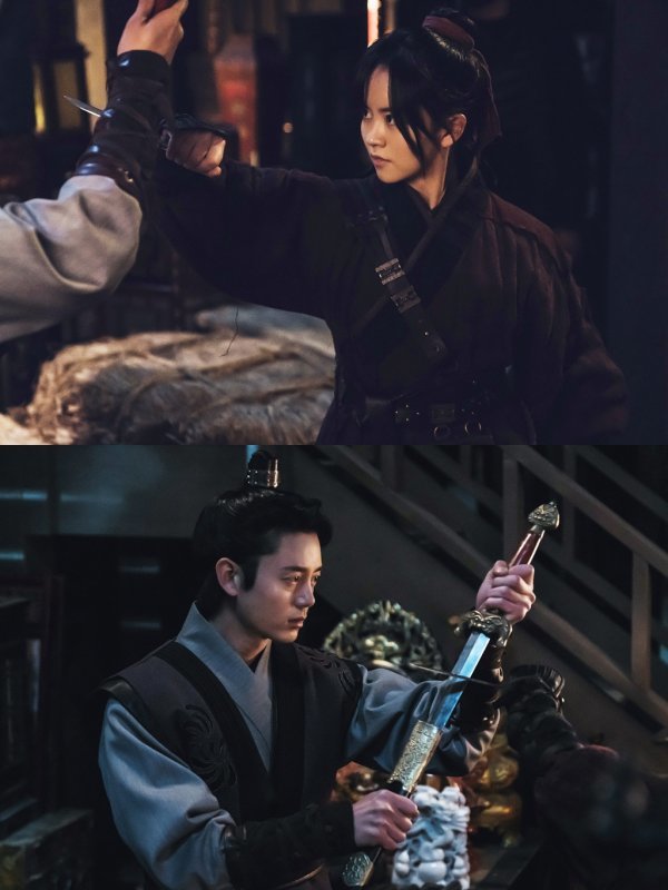 이런 가운데 22일 \'달이 뜨는 강\' 제작진은 다시 만난 염가진과 고건을 담은 스틸 컷을 공개했다. 사진 속 염가진은 자신의 주 무기인 단도를, 고건은 화려한 장검을 들고 있다. 칼과 칼의 부딪힘만큼 팽팽하게 맞붙는 두 사람의 눈빛에서 강렬한 스파크가 튀는 듯하다.