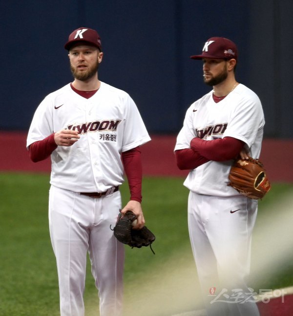 22일 서울 고척스카이돔에서 진행된 키움 히어로즈의 2021 국내 스프링캠프에서 요키시와 스미스가 이야기를 나누고 있다.