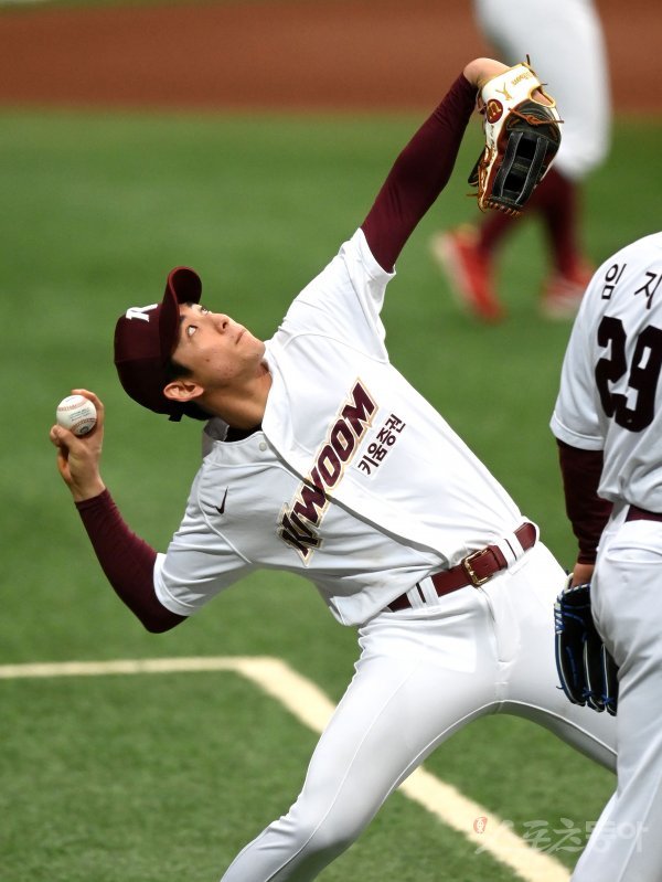 22일 서울 고척스카이돔에서 진행된 키움 히어로즈의 2021 국내 스프링캠프에서 이정후가 돔 천장을 향해 공을 던지고 있다.