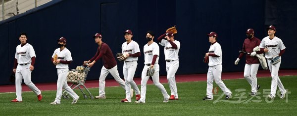22일 서울 고척스카이돔에서 진행된 키움 히어로즈의 2021 국내 스프링캠프에서 외야수들이 수비 훈련을 마치고 더그아웃으로 향하고 있다.