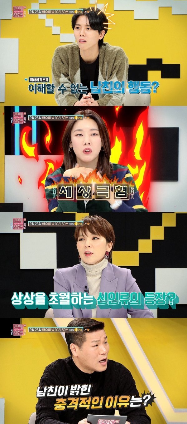 주우재는 "이 남친은 회로가 딱 저렇게만 돌아가는 사람이다"라며 안타까워하고, 곽정은은 "세상엔 내가 모르는 인류가 많은 것 같다"라며 탄식한다. 한혜진 역시 "극혐이다. 영화 \'베테랑\' 보는 것 같다. \'연참\'에서 여러 사연을 봤지만 이건 종합선물세트 수준"이라며 놀란다.