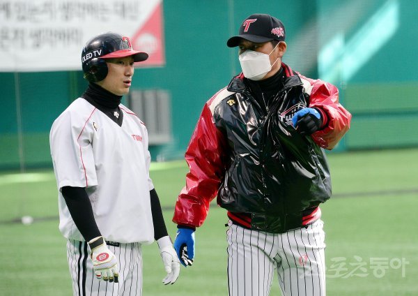 23일 경기도 이천 LG챔피언스파크에서 프로야구 LG 트윈스의 2021 스프링캠프가 열렸다. LG 이종범 코치가 신민재와 이야기를 나누고 있다.