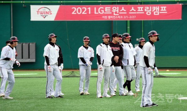 23일 경기도 이천 LG챔피언스파크에서 프로야구 LG 트윈스의 2021 스프링캠프가 열렸다. 쌀쌀한 날씨에 LG 선수들이 실내구장에서 훈련을 펼치고 있다.