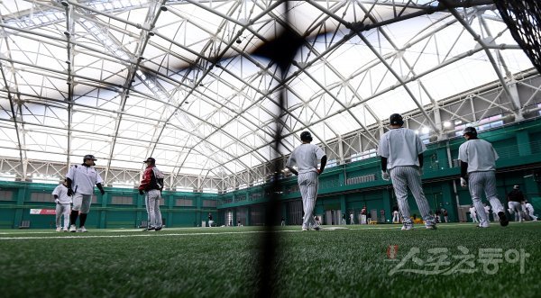 23일 경기도 이천 LG챔피언스파크에서 프로야구 LG 트윈스의 2021 스프링캠프가 열렸다. LG 선수들이 실내구장에서 훈련을 하고 있다.