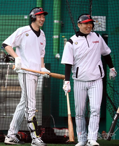 LG 김용의(왼쪽)와 이성우가 23일 이천 LG챔피언스파크에서 진행된 팀 훈련 도중 동료들을 바라보며 미소 짓고 있다. 이들은 ‘덕아웃 리더’로 팀에 긍정 에너지를 불어넣고 있다. 이천 | 김민성 기자 marineboy@donga.com