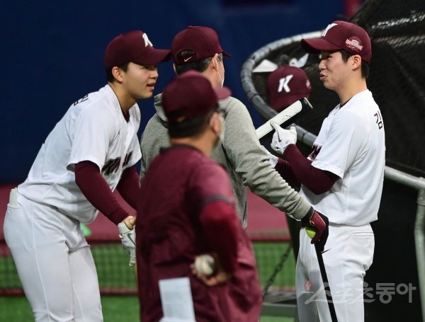 24일 서울 고척스카이돔에서 열린 키움 히어로즈의 2021 스프링캠프에서 김혜성과 김휘집이 타격 훈련 중 이야기를 하고 있다.