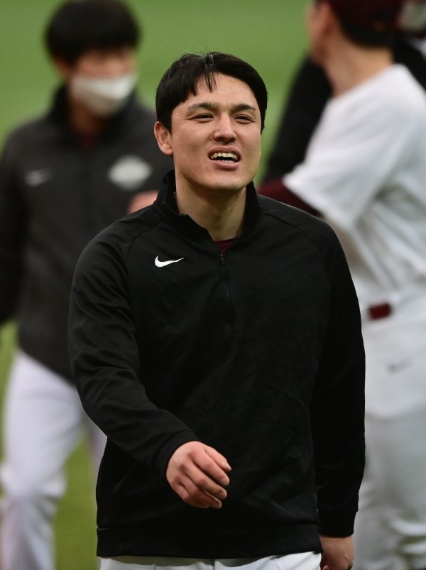 24일 서울 고척스카이돔에서 열린 키움 히어로즈의 2021 스프링캠프에서 박동원이 몸 풀기를 마친 후 숨을 몰아쉬고 있다.
