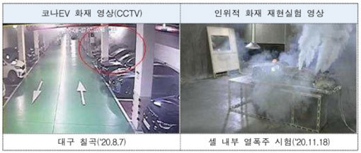 현재까지 자동차안전연구원과 관련 전문가 합동조사 결과에 따르면 인위적인 화재 재현실험을 통해 배터리셀 내부 열 폭주 시험에서 발생된 화재 영상이 실제 코나EV 화재 영상(대구 칠곡 CCTV)과 유사한 것을 확인했다. 또한 리콜로 수거된 불량 고전압 배터리 분해 정밀조사결과 셀 내부 정렬 불량(음극탭 접힘)으로 인해 화재가 발생할 가능성을 확인했다. 현재 화재 재현실험 중인데 현재까지는 화재가 발생하지 않았다.