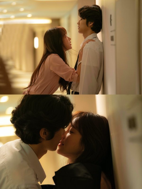카카오M은 27일 오후 5시 공개되는 ‘아직 낫서른’ 2회를 앞두고, 흐트러진 이란주와 6살 연하남 형준영(백성철 분)의 키스 직전 순간을 공개했다. 셔츠와 넥타이까지 갖춘 수트 차림의 형준영은 어른인 듯 어딘지 어려보이는 모습. 그런 그의 어깨에 매달린 듯 나른한 눈빛으로 형준영을 바라보는 이란주의 모습은 금방이라도 ‘격정 로맨스’가 시작될 것 같은 아슬아슬한 떨림을 전한다. 숨소리마저 들릴 듯 초밀착한 키스 직전의 순간은 두 사람의 급발진 로맨스에 대한 기대를 한껏 높이고 있다.