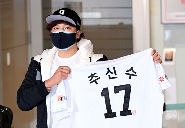 신세계 프로야구단에 입단하는 추신수가 25일 인천국제공항을 통해 귀국해 유니폼을 입고 카메라를 향해 포즈를 취하고 있다.