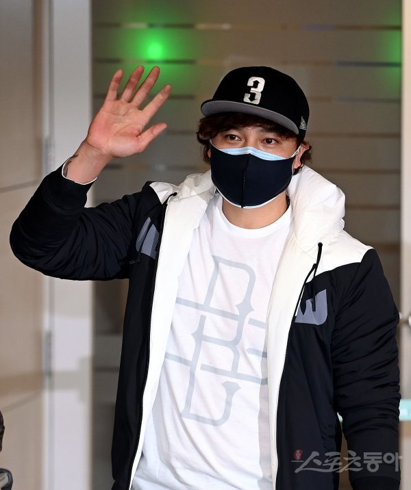 신세계 프로야구단에 입단하는 추신수가 25일 인천국제공항을 통해 귀국해 카메라를 향해 손을 흔들고 있다.