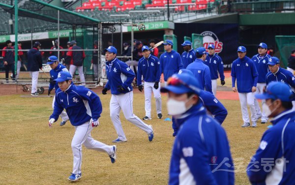 1일 부산 사직야구장에서 2021 KBO리그 롯데 자이언츠와 삼성 라이온즈의 연습경기가 열린다. 경기에 앞서 롯데와 삼성 선수들이 훈련을 하고 있다.