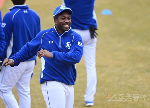 1일 부산 사직야구장에서 2021 KBO리그 롯데 자이언츠와 삼성 라이온즈의 연습경기가 열린다. 경기에 앞서 삼성 피렐라가 몸을 풀며 웃고 있다.