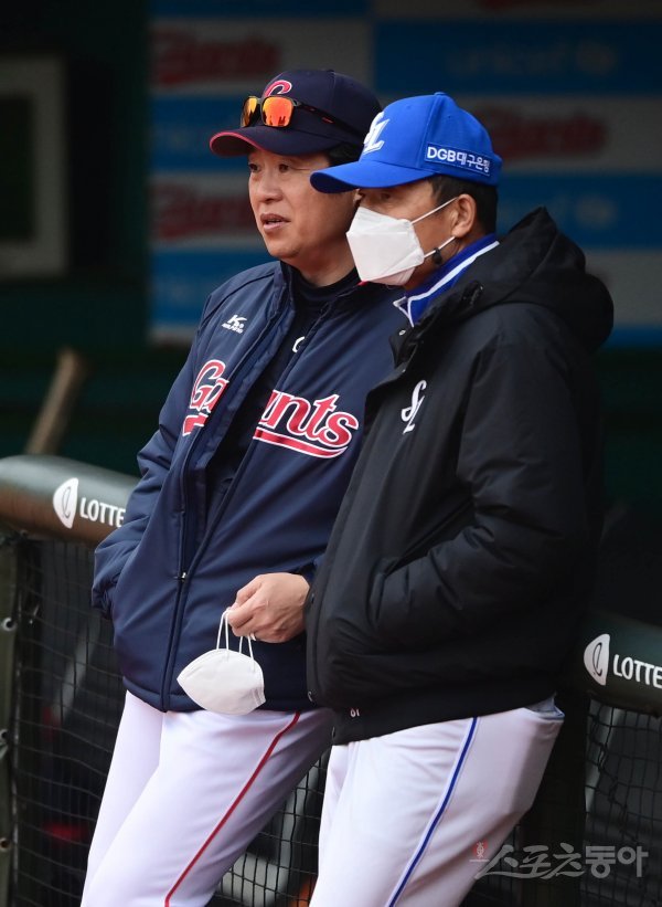 1일 부산 사직야구장에서 2021 KBO리그 롯데 자이언츠와 삼성 라이온즈의 연습경기가 열린다. 경기에 앞서 롯데 허문회 감독과 삼성 김용달 코치가 이야기를 하고 있다.