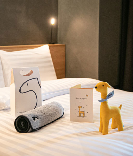 소노펫클럽&리조트는 재방문객이 증가함에 따라 직접 제작한 PB 상품들로 새롭게 리뉴얼했다. 신규 웰컴키트는 소노펫 리놀럭스 타월, 소냐르 인형, 소냐르 스토리북 등 3가지다.