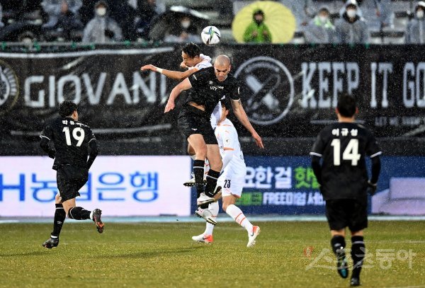 1일 경기도 성남 탄천종합운동장에서 열린 ‘하나원큐 K리그1 2021’ 성남 FC와 제주 유나이티드의 경기에서 성남 뮬리치가 제주 선수와 헤딩경합을 펼치고 있다.