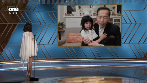 영화 ‘미나리’를 연출한 정이삭 감독(맨 오른쪽)이 1일(한국시간) 온라인 화상으로 연결돼 진행된 제78회 골든글로브 시상식에서 딸을 안고 최우수 외국어영화상 수상 소감을 밝히고 있다. 사진제공|판씨네마