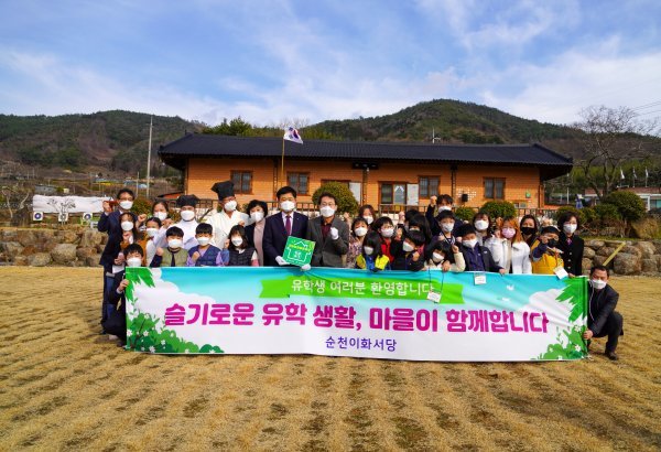 2월 26일 농촌유학생 환영식을 맞아 순천이화서당을 방문한 장석웅 전남교육청 교육감, 조희연 서울시교육청 교육감(가운데 왼쪽부터)이 학생, 학부모, 관계자들과 함께 기념촬영을 하고 있다. 사진제공 | 서울시교육청