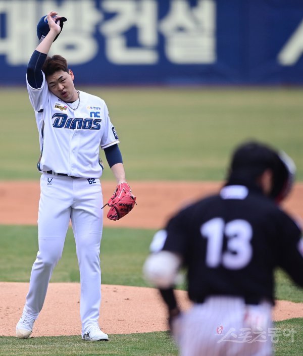 2일 창원NC파크에서 2021 KBO리그 NC 다이노스와 LG 트윈스의 연습경기가 열렸다. 1회초 NC 송명기가 몸에 맞는 볼을 던진 뒤 모자를 벗고 있다.