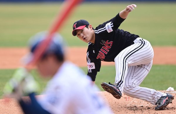 2일 창원NC파크에서 2021 KBO리그 NC 다이노스와 LG 트윈스의 연습경기가 열렸다. 1회초 LG 임준형이 투구 동작 과정에서 넘어지고 있다.