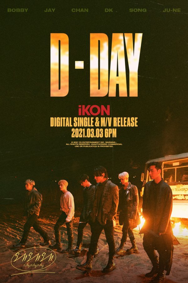 YG엔터테인먼트는 3일 공식 블로그에 아이콘의 컴백이 임박했음을 알리는 D-DAY 포스터를 공개했다. 타오르는 불꽃을 뒤로 한 채 전진해 나가는 아이콘 완전체 모습이 담겼다. 아이콘 여섯 멤버의 강렬한 눈빛과 성숙한 카리스마가 물씬 풍겨 신곡 콘셉트에 대한 호기심을 자극한다.