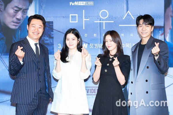 배우 이희준, 박주현, 경수진, 이승기(왼쪽부터)가 3일 오전 tvN 새 수목드라마 \'마우스\' 온라인 제작발표회에 참석해 포즈를 취하고 있다.