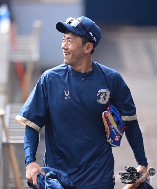 3일 창원NC파크에서 2021 KBO리그 NC 다이노스와 LG 트윈스의 연습경기가 열린다. 경기에 앞서 NC 이명기가 훈련을 마친 뒤 웃고 있다.