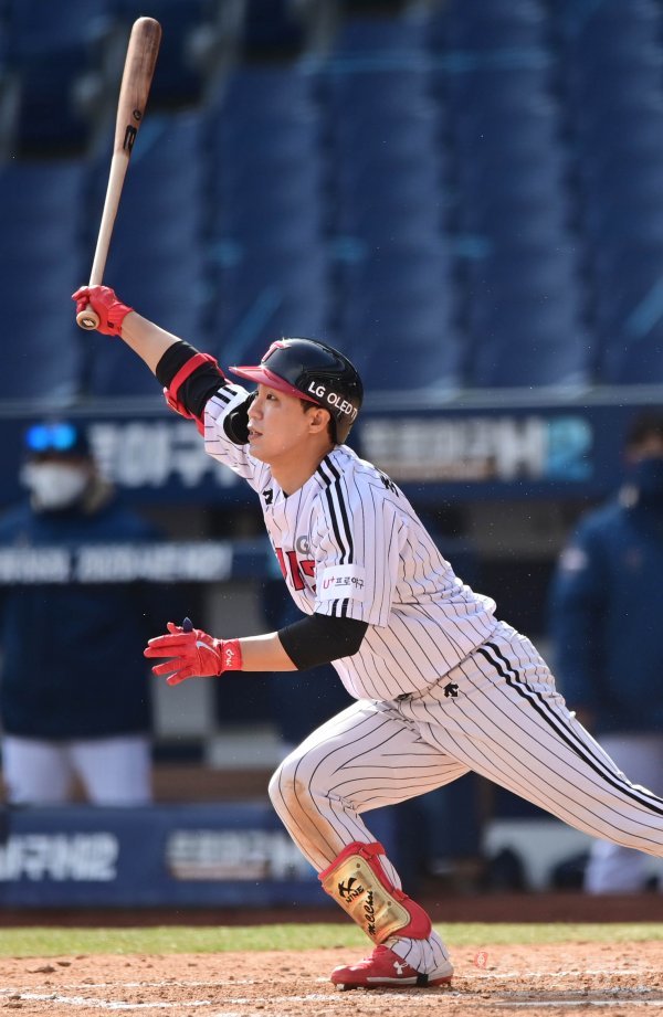 3일 창원NC파크에서 2021 KBO리그 NC 다이노스와 LG 트윈스의 연습경기가 열렸다. 6회말 1사 만루 LG 최민창이 동점 중전 안타를 치고 있다.