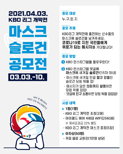 KBO(총재 정지택)는 3일부터 야구팬들을 대상으로 ‘KBO 리그 개막전 마스크 슬로건’ 공모전을 진행한다.