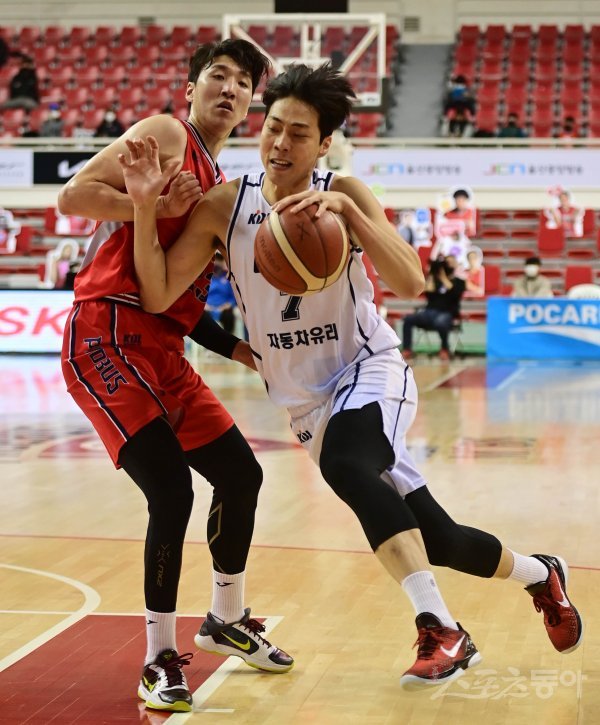 3일 울산동천체육관에서 열린 ‘2020-2021 현대모비스 프로농구’ 울산 현대모비스와 전주 KCC의 경기에서 KCC 정창영이 현대모비스 김민구의 수비를 뚫고 드리블 돌파를 하고 있다.