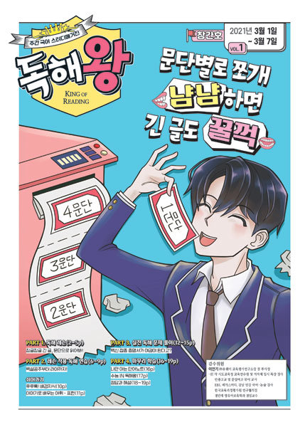 2021학년도 수능 국어에선 코로나19 상황과 연계된 비문학 지문이 출제됐다. 최신의 정보, 시사이슈를 다룬 지문 적응력을 높이는 것이 이토록 중요하다. ‘독해왕’은 최신의 뉴스를 바탕으로 만들어진 비문학 지문이 인문, 사회, 과학, 기술, 예술을 망라해 매주 실린다. 매주 중요한 이슈를 제재로 선택해 발행되는 국어 학습지는 ‘독해왕’이 유일하다.