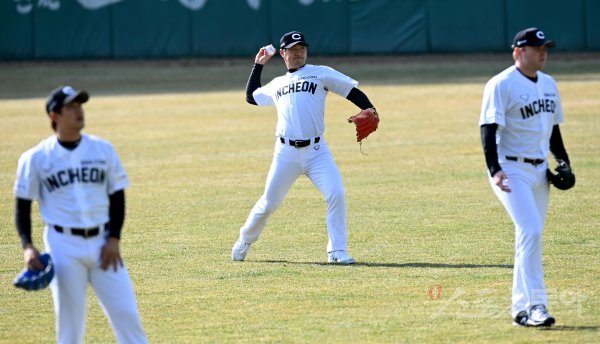 8일 인천 문학야구장에서 SK 와이번스를 인수한 SSG 랜더스가 홈에서 첫 훈련을 가졌다. SSG 하재훈이 캐치볼을 하고 있다.