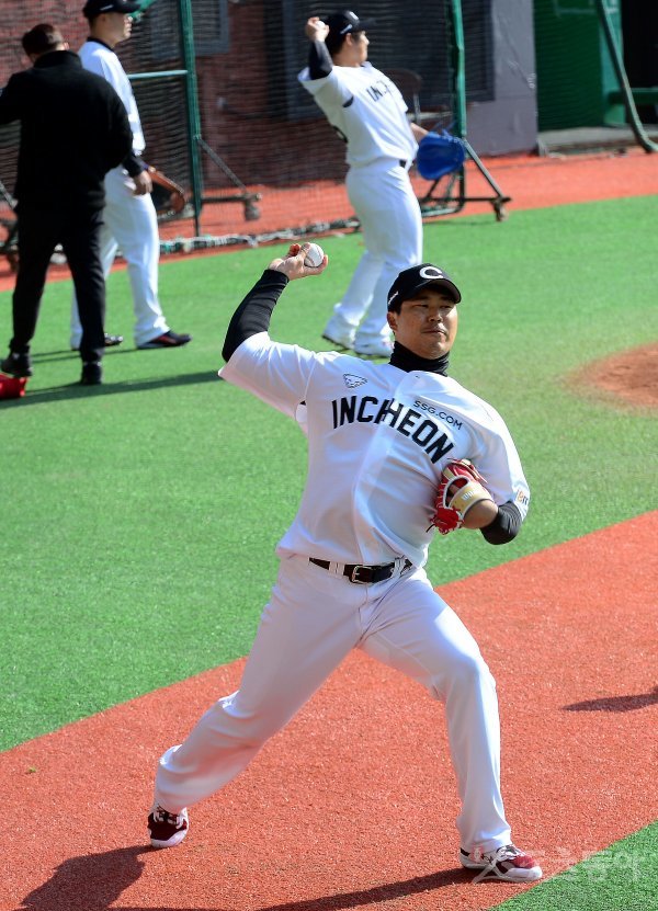 8일 인천 문학야구장에서 SK 와이번스를 인수한 SSG 랜더스가 홈에서 첫 훈련을 가졌다. SSG 한유섬이 캐치볼을 하고 있다.