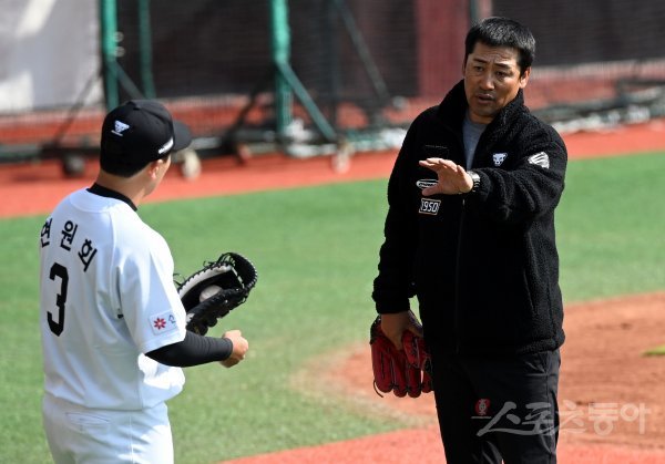 8일 인천 문학야구장에서 SK 와이번스를 인수한 SSG 랜더스가 홈에서 첫 훈련을 가졌다. SSG 김민재 코치가 현원회에게 훈련을 지도하고 있다.
