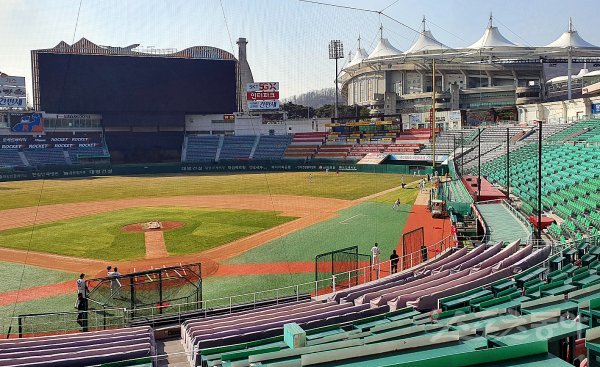 8일 인천 문학야구장에서 SK 와이번스를 인수한 SSG 랜더스가 홈에서 첫 훈련을 가졌다. 외야 전광판에 SK행복드림구장 명칭이 지워져 있다.