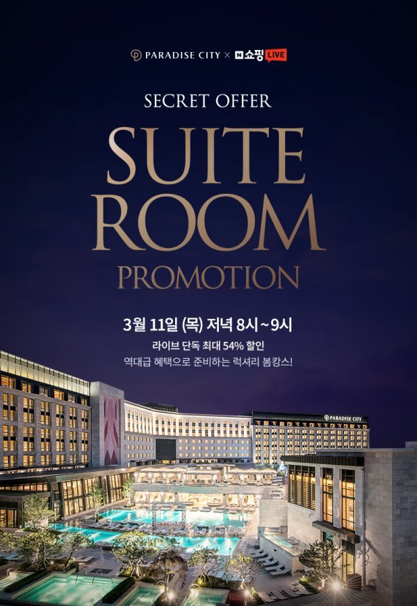 영종도 복합리조트 파라다이스시티가 첫 라이브 커머스를 진행한다. 11일 오후 8시부터 9시까지 네이버 쇼핑라이브에서 ‘스위트룸 프로모션’ 패키지를 한정 판매한다. 최고급 디럭스 스위트룸 1박에 각종 부대시설 이용과 선물로 구성해 최대 54% 할인까지 제공한다. 디럭스 스위트룸에 다양한 특전 포함