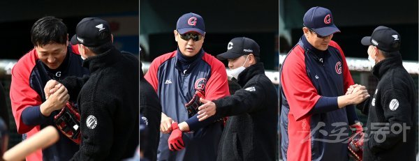 9일 부산 사직야구장에서 롯데 자이언츠와 SSG 랜더스의 연습경기가 열린다. 경기 전 롯데 이대호와 SSG 김원형 감독이 이야기를 나누고 있다.