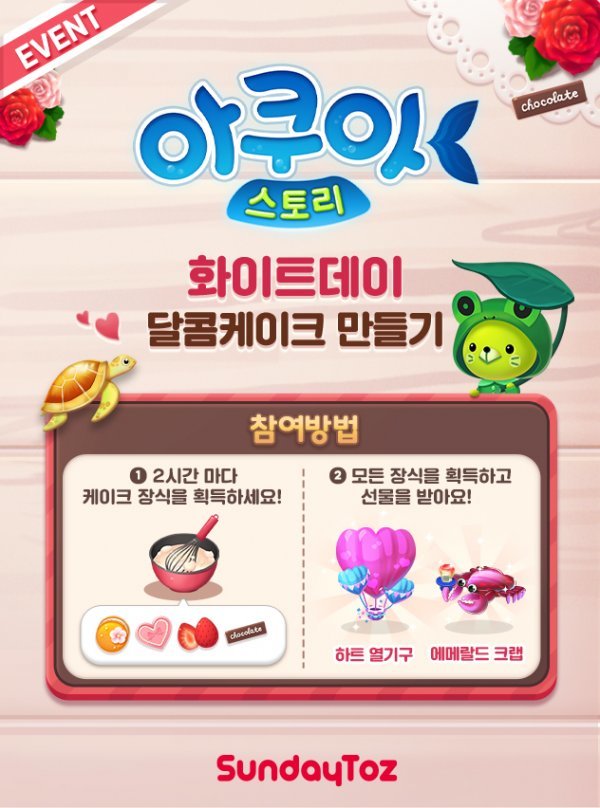 선데이토즈는 자사의 모바일 SNG \'아쿠아스토리\'에서 화이트데이를 맞아 \'달콤케이크 만들기\' 이벤트와 콘텐츠 업데이트를 진행한다고 9일 밝혔다.