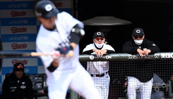 9일 부산 사직야구장에서 롯데 자이언츠와 SSG 랜더스의 연습경기가 열렸다. SSG 김원형 감독이 경기를 지켜보고 있다.
