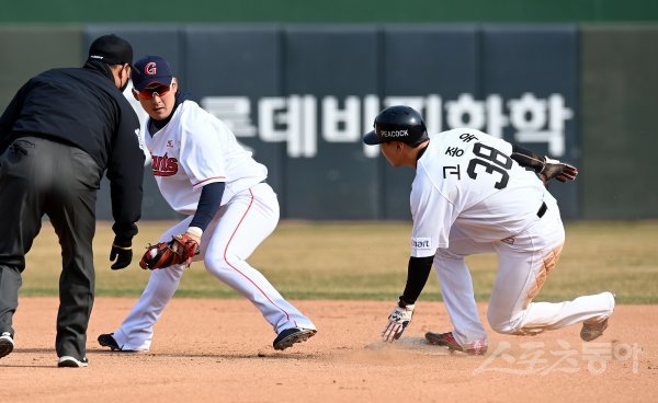 9일 부산 사직야구장에서 롯데 자이언츠와 SSG 랜더스의 연습경기가 열렸다. 6회초 2사 1루에서 SSG 고명준 타석 때 1루 주자 고종욱이 폭투로 2루까지 진루하고 있다.