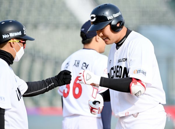 9일 부산 사직야구장에서 롯데 자이언츠와 SSG 랜더스의 연습경기가 열렸다. 8회초 1사 만루에서 SSG 고명준이 1타점 적시타를 날린 뒤 조동화 코치의 환영을 받고 있다.