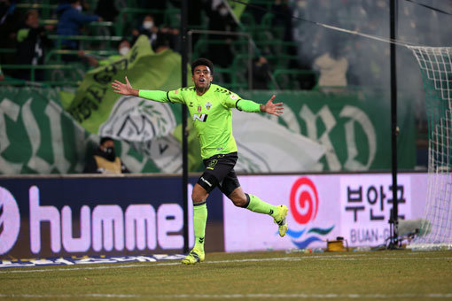 전북 외국인선수 구스타보가 9일 전주월드컵경기장에서 벌어진 K리그1(1부) 3라운드 강원과 홈경기 후반 47분 2-1 역전승을 완성하는 헤딩 결승골을 터트린 뒤 환호하고 있다. 디펜딩 챔피언 전북은 2021시즌 개막 후 2승1무를 기록했다. 사진제공|한국프로축구연맹