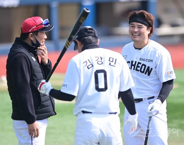 14일 울산문수야구장에서 2021 KBO리그 KT 위즈와 SSG 랜더스의 연습 경기가 열린다. 경기에 앞서 SSG 추신수가 KT 조중근 코치와 이야기를 하고 있다.