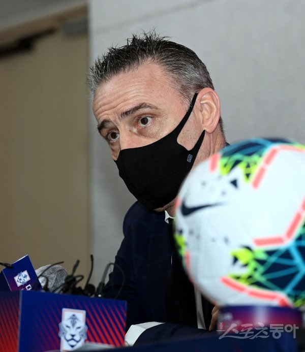 오는 25일 일본과의 A매치를 앞두고 한국축구국가대표팀 벤투 감독이 15일 서울 신문로 축구회관에서 국가대표팀 소집 선수 명단을 발표하고 있다.