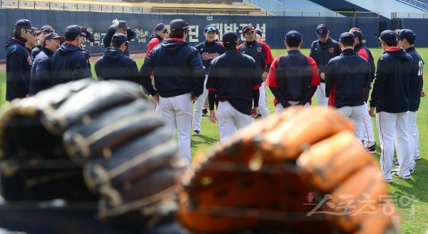 16일 창원NC파크에서 2021 KBO리그 NC 다이노스와 롯데 자이언츠의 연습 경기가 열린다. 롯데 선수들이 훈련에 앞서 미팅을 하고 있다.