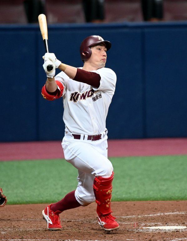 16일 서울 고척스카이돔에서 키움 히어로즈와 LG 트윈스의 연습경기가 열렸다. 5회말 무사 만루에서 키움 서건창이 2타점 2루타를 날리고 있다.