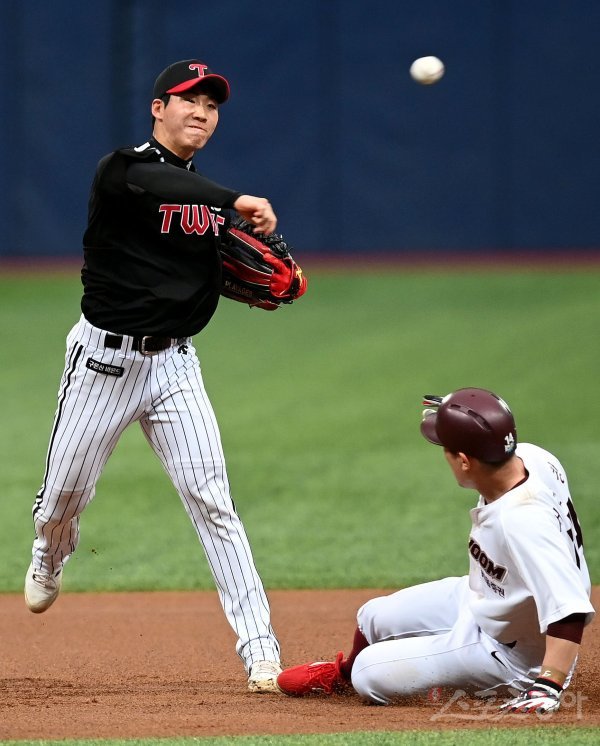 16일 서울 고척스카이돔에서 키움 히어로즈와 LG 트윈스의 연습경기가 열렸다. 1회말 무사 1루에서 키움 이용규의 내야 땅볼 때 LG 이주형이 1루 주자 서건창을 2루에서 포스 아웃시킨 뒤 1루 송구하고 있다.