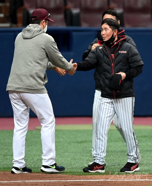 16일 서울 고척스카이돔에서 키움 히어로즈와 LG 트윈스의 연습경기가 열렸다. 키움과 LG가 4-4 무승부를 기록한 뒤 홍원기, 류지현 감독이 서로 악수를 나누고 있다.