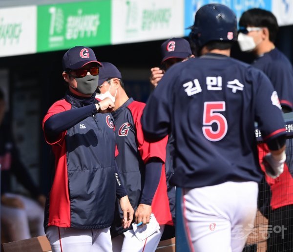 16일 창원NC파크에서 2021 KBO리그 NC 다이노스와 롯데 자이언츠의 연습 경기가 열렸다. 7회초 2사 롯데 김민수가 좌월 솔로 홈런을 쳐낸 뒤 더그아웃에서 허문회 감독의 축하를 받고 있다.